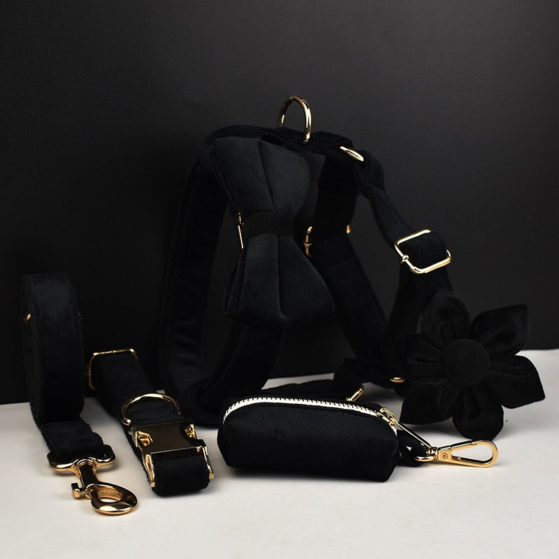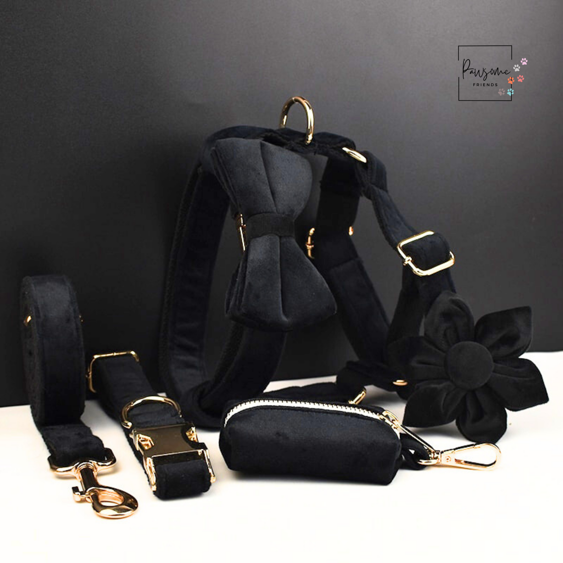Elevate your dog's fashion game with our Black Velvet Collection, where sophistication meets comfort. Let your furry friend exude timeless elegance with our velvet harness, collar, lead, and bow. Celebrate the bond between style and your beloved companion, and make every outing a fashion statement.