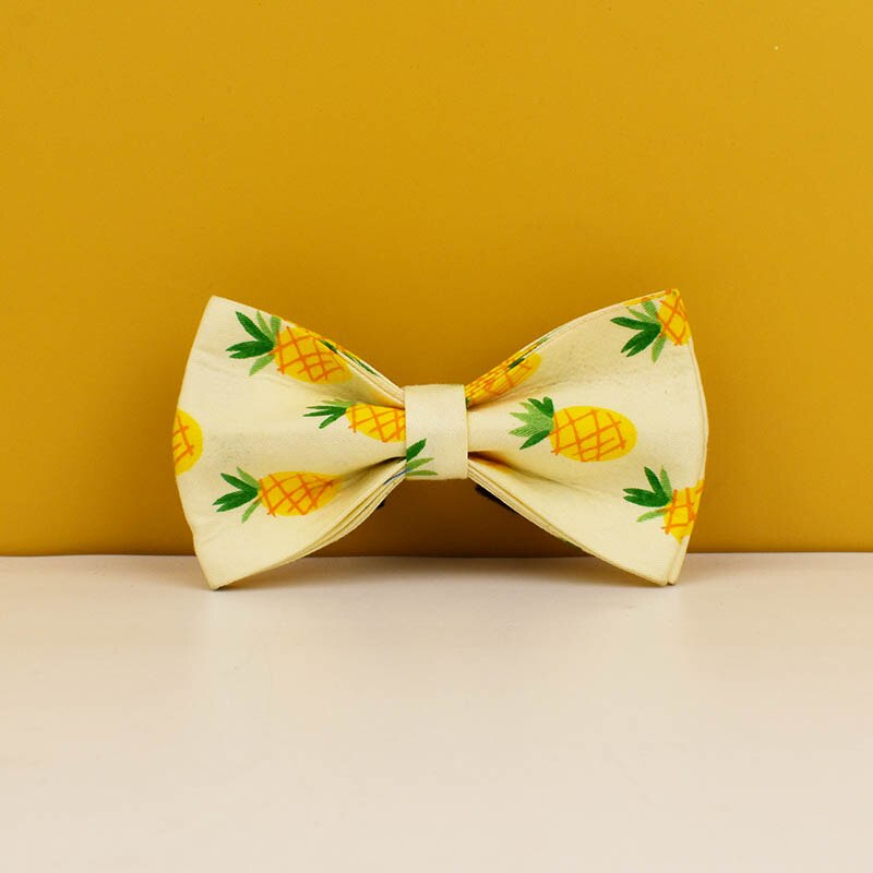 Playful Pineapple Print Bow: Complete your dog's ensemble with our Playful Pineapple Print Bow, a charming accessory that adds a dash of whimsy. The colourful pineapple print creates a vibrant and joyful look, making your furry friend stand out in any setting. Easily attach the bow to your dog's collar or harness, and let them shine with their playful style.