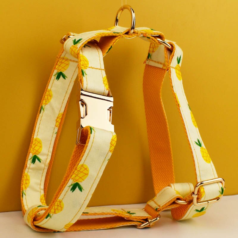 Playful Pineapple Print Harness: Wrap your pup in the cheerful embrace of our Playful Pineapple Print Harness. Crafted from high-quality materials, this harness offers both comfort and durability. The adjustable straps ensure a secure and customised fit, while the colourful pineapple print adds a touch of whimsy and personality. Let your dog walk with a spring in their step and a smile on their face in this delightful harness.