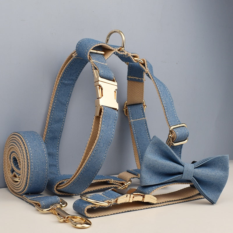 Indulge your dog in the casual charm of our Denim Collection. Let them revel in the comfort and style of the denim harness, collar, lead, and bow. Celebrate the bond between fashion and your beloved companion, and make every outing a fashionable and memorable one.