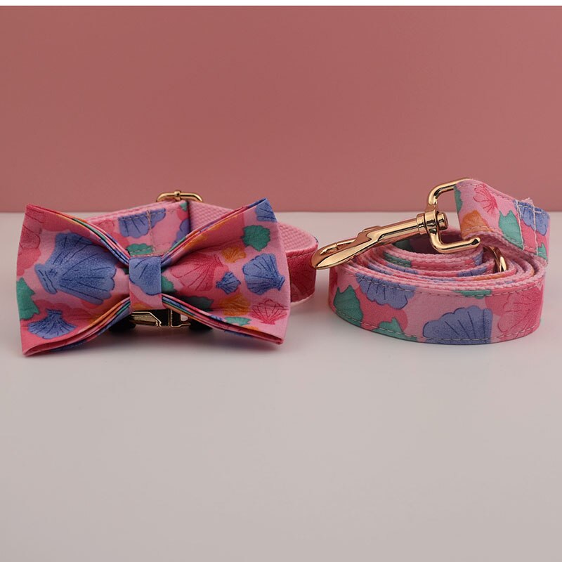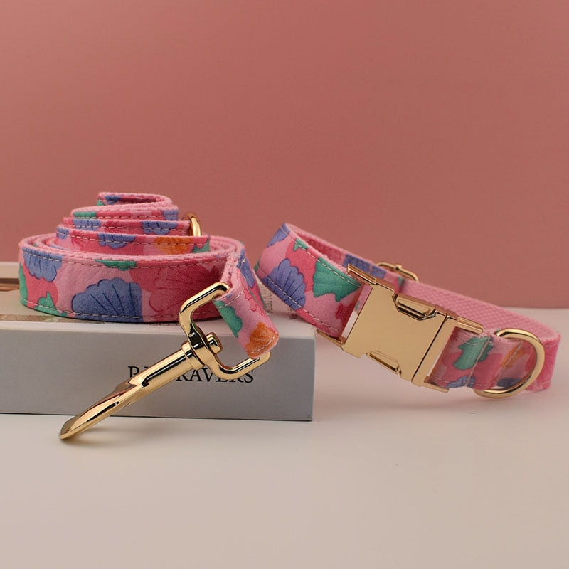 The pink shell print on the collar and lead is a playful and fun design, featuring various pastel shades with an intricate shell pattern throughout. The design is reminiscent of a seaside vacation and is sure to make your dog stand out in a crowd.