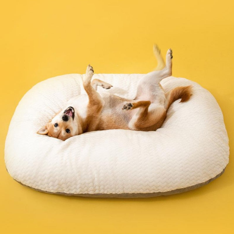 The bed consists of a thick cushion that is stuffed with soft filling material to provide a comfortable sleeping surface for your dog. The cushion is covered with a soft fabric that is gentle on your pup's skin and provides a cozy feel.